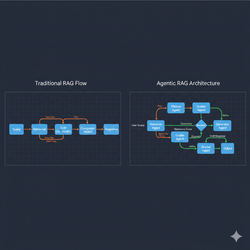 Agentic RAG replaces the linear pipeline with a graph-based orchestration system where specialized agents collaborate.