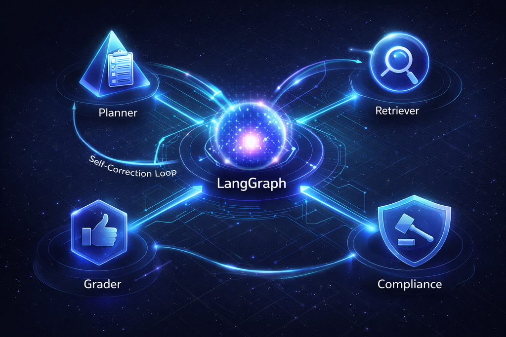 - User Query → Planner → Retriever → Grader → [Loop if needed] → Compliance → Generator → Response